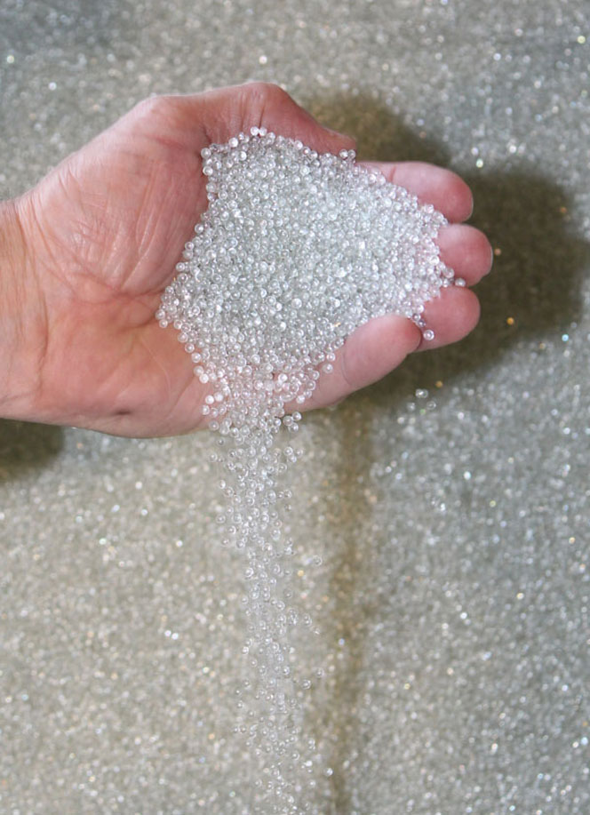 Crystal beads are added in order to improve the identification of lines at night, to improve the brightness and durability of the marking. Crystal bead is colorless and transparent ball, has function of light refraction, focusing and directional reflection. Crystal bead mixed in the coating or dispensed throughout the coating surface can reflect car light back to the driver’s eyes, thus greatly improving the marking visibility. Flat glass cullet (waste glass from window manufacturers) is crushed and transformed in furnaces into spherically shaped reflectors that become a road safety product.